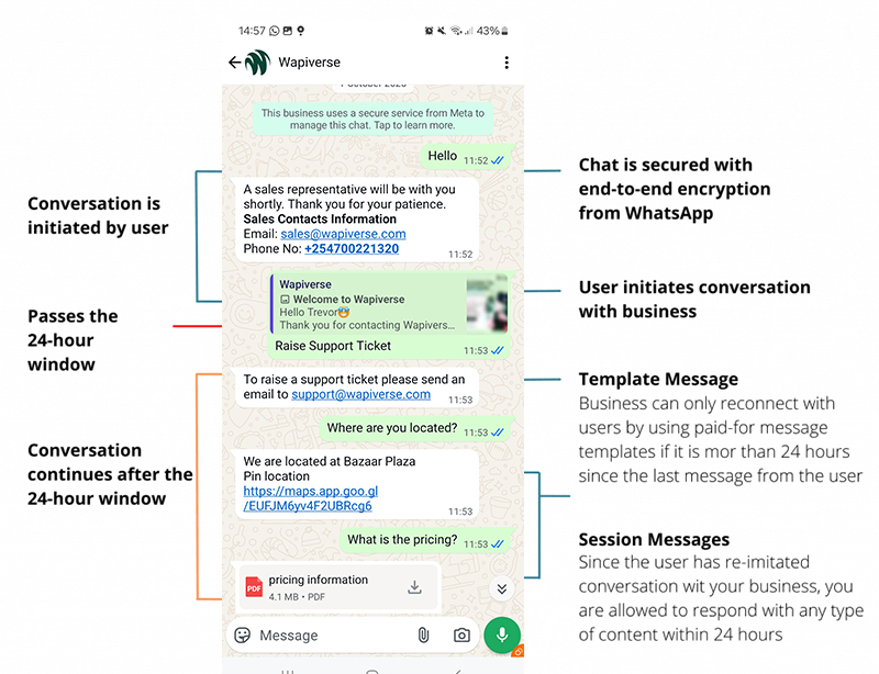 When a user messages your business, a 24-hour customer service window opens. Replies and utility templates sent within this window are free. However, if your business initiates a conversation with a template message outside this window, charges apply.